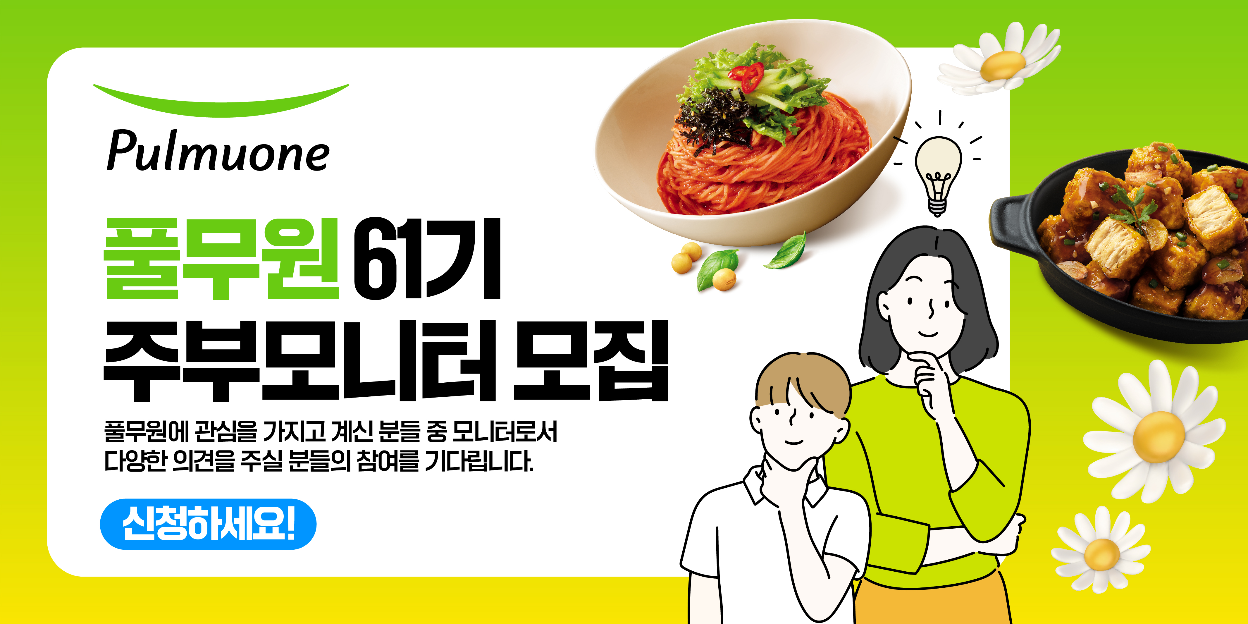 풀무원에 관심을 가지고 계신 분들 중 모니터로서 풀무원의 제품 개발에 다양한 의견을 주실 분들의 참여를 기다립니다.