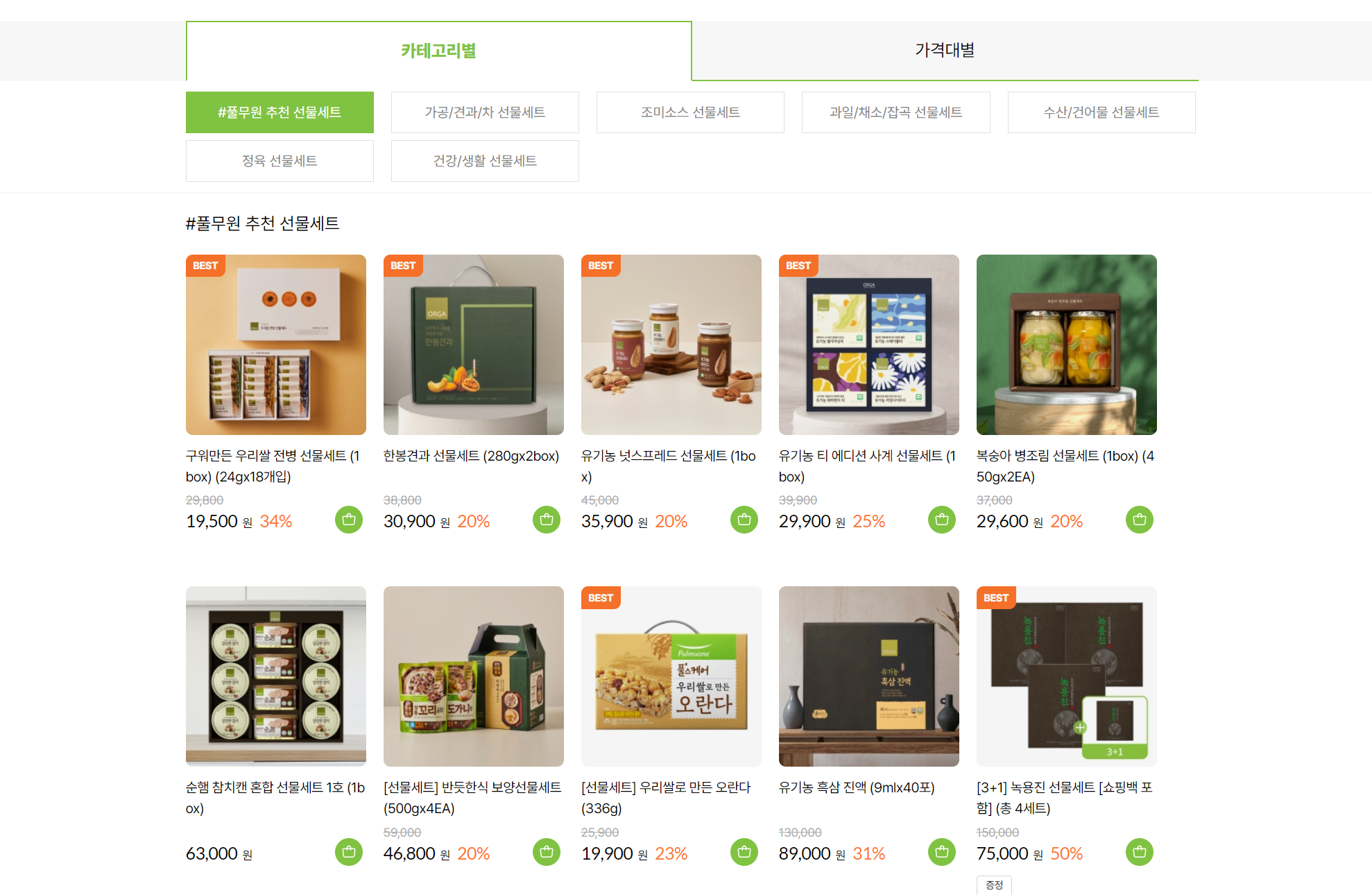 풀무원에서 인기 있는 다양한 선물 세트가 모두 모여있는