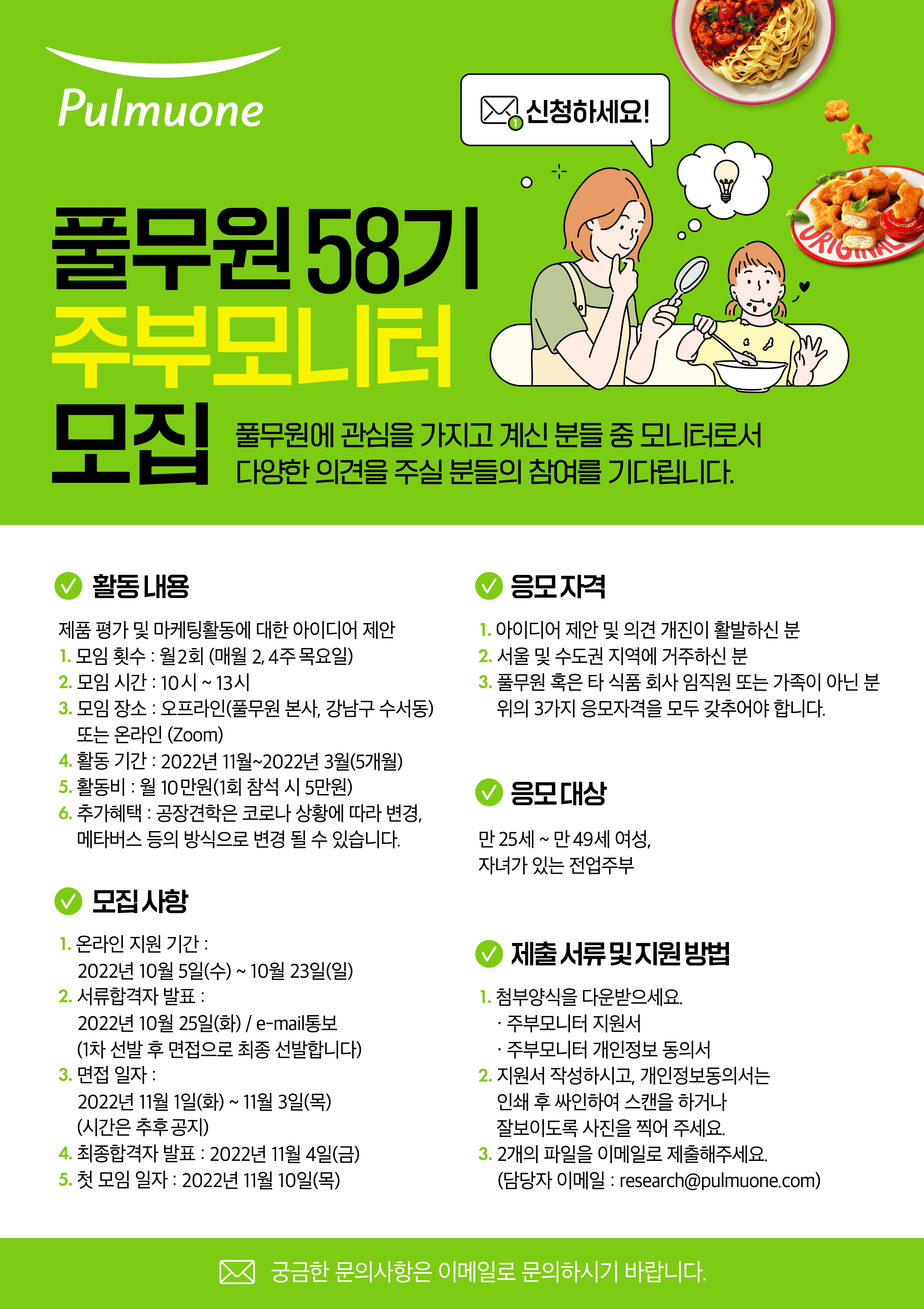 만 25~49세의 자녀가 있는 전업주부로서 서울, 경기지역에 거주하며 본인 또는 가족이 풀무원 혹은 다른 식품 회사에 관련되지 않은 분이셔야 합니다.