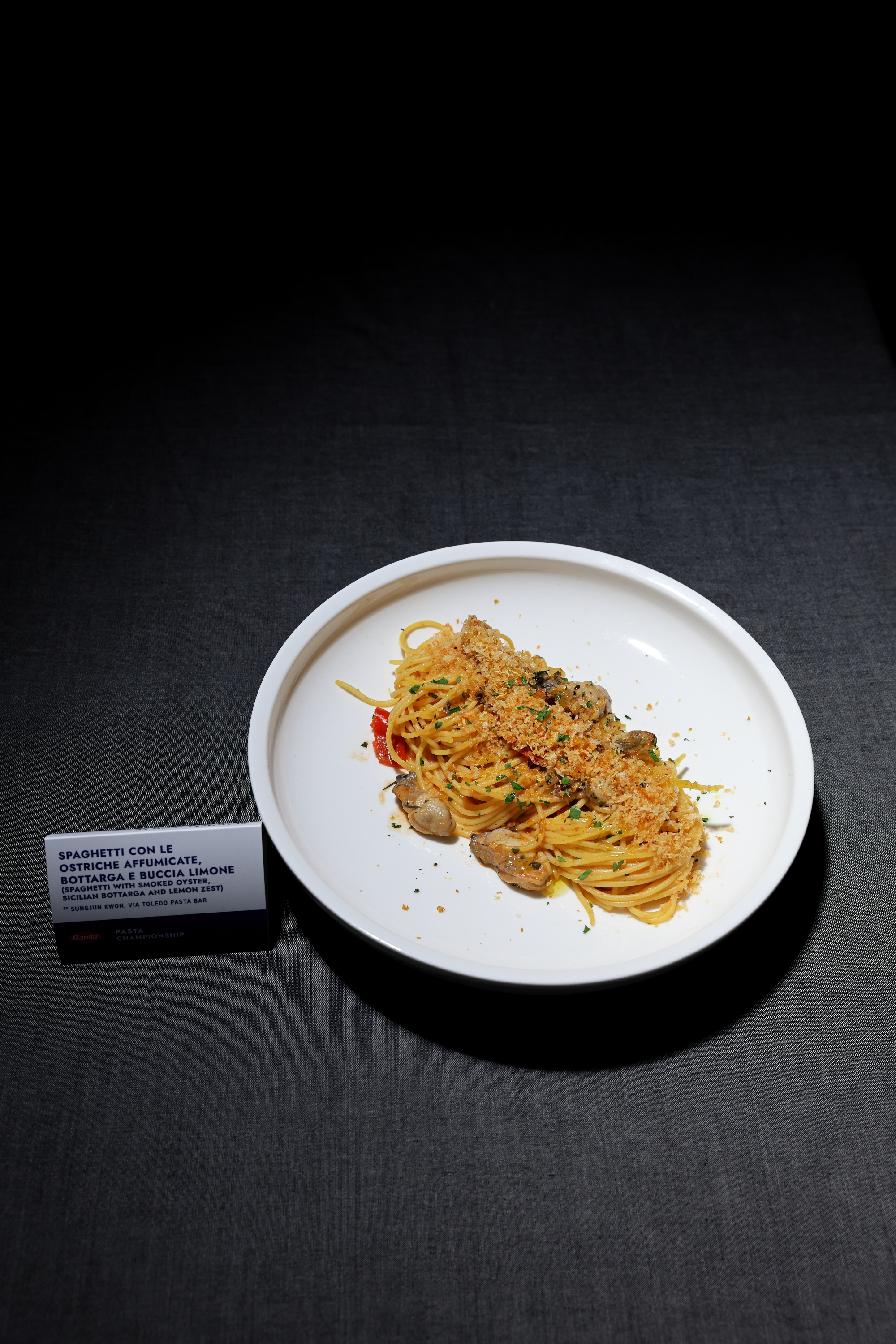 (spaghetti with smoked oyster, sicilian bottarga and lemon zest)
