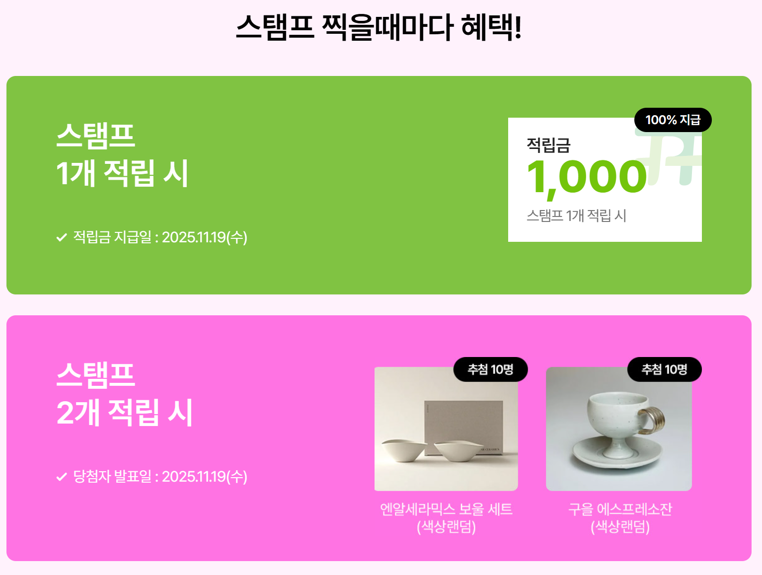 스탬프 적립 이벤트를 통해 1회 적립 시 1천 원 적립금을 100% 드리고